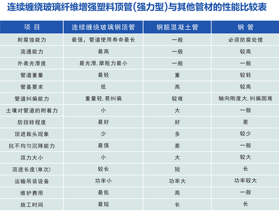 强力型顶管压缩强度较高,刚度较高(刚度20000-150000N/㎡),许用顶力高于传统玻璃钢顶管。