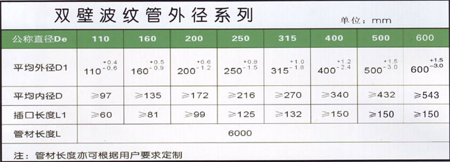 按照国家标准GB/T18477.1-2007《埋地排水用硬聚氯乙烯(PVC-U)结构壁管道系统 第1部分:双壁波纹管材》技术标准生产。